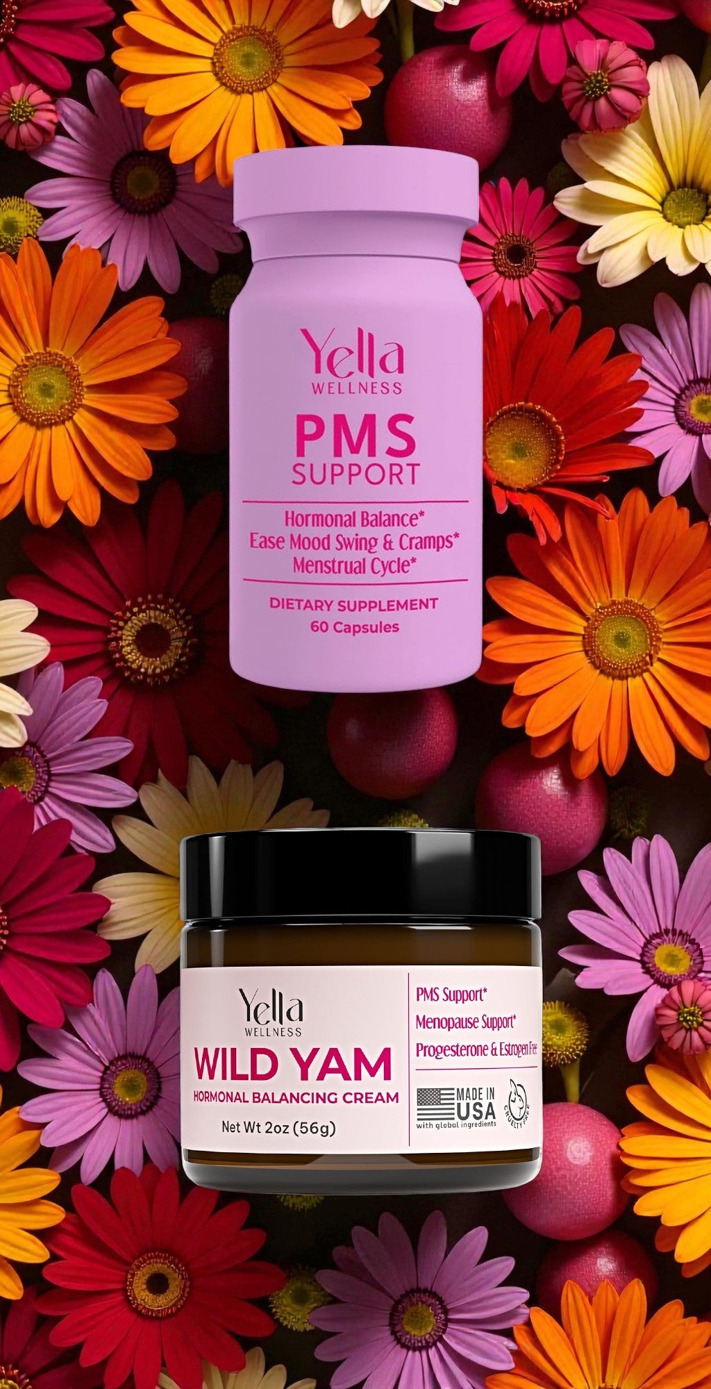 No. The Duo contains zero estrogen, progesterone, or synthetic hormones. PMS Support uses vitamins + botanicals, and Wild Yam Cream offers plant-based comfort support only.