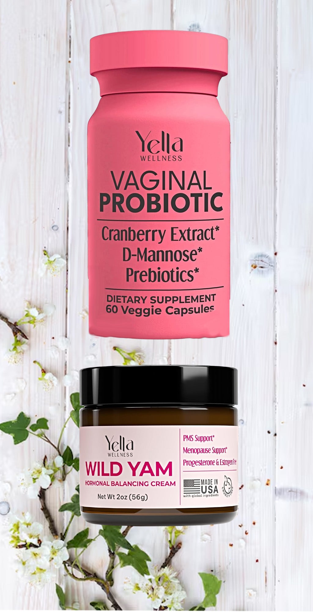 Take 2 Vaginal Probiotic capsules in the morning (ideally with food), and apply Wild Yam Cream morning + evening to thin-skin areas. This pairing supports daily comfort, vaginal balance, and hormone-calming ease.